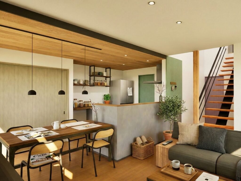 木の優しい雰囲気の中にインダストリアルな鉄骨階段が